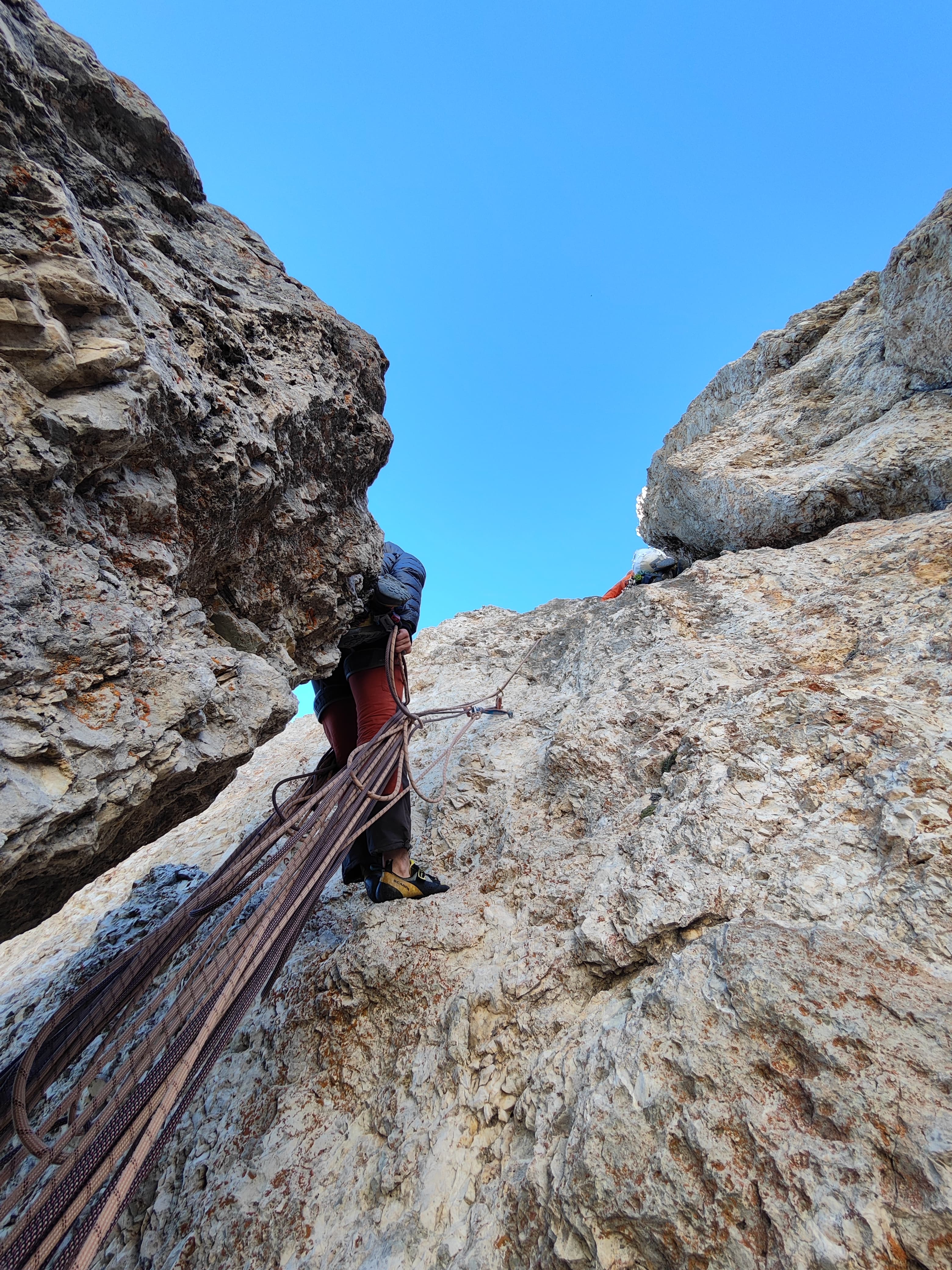 Ob osmih zjutraj na falzaregu led na šajbah, pole kafe pa jajca, in se malo pogret. Ob enajstih plezat, na soncu čista uživancija, v senci nohta in plezaš v puhici. Za nagrado pa še sami v smeri.